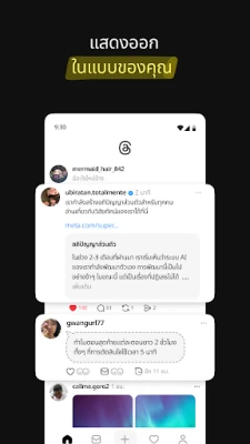 Threads คือพื้นที่ดิจิทัลที่เปรียบเสมือนจัตุรัสกลางเมือง ให้คุณได้มาร่วมแลกเปลี่ยน ถกประเด็น และสำรวจทุกสรรพสิ่ง ตั้งแต่กระแสสังคมที่กำลังเป็นที่พูดถึงไปจนถึงหัวข้อเฉพาะทางที่คุณหลงใหล ไม่ว่าจะเป็นนักสร้างสรรค์ แรงบันดาลใจ หรือเพียงผู้ที่ต้องการเชื่อมต่อกับผู้อื่นที่มีความสนใจเดียวกัน Threads เปิดโอกาสให้คุณได้สร้างสรรค์เครือข่ายความสัมพันธ์อันแน่นแฟ้น แบ่งปันความคิดเห็น และเผยแพร่แนวคิดใหม่ๆ สู่สายตาโลกอย่างอิสระ