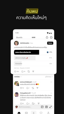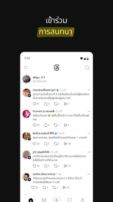 ดำดิ่งสู่บทสนทนาที่น่าสนใจที่สุด ตอบกลับ แสดงความรู้สึก และดื่มด่ำไปกับอารมณ์ขันและมุมมองอันลึกซึ้งจากผู้คนทั่วโลก ค้นพบกลุ่มชุมชนที่สอดคล้องกับจิตวิญญาณของคุณ และสร้างมิตรภาพใหม่ๆ กับผู้ที่มีใจเดียวกัน นอกจากนี้ Threads ยังเป็นแหล่งรวมข้อมูลและแรงบันดาลใจชั้นยอด ไม่ว่าจะเป็นคำตอบสำหรับข้อสงสัย หรือการเรียนรู้สิ่งใหม่ๆ จากผู้เชี่ยวชาญและผู้นำทางความคิดในทุกสาขาอาชีพ เพื่อให้คุณไม่พลาดทุกกระแสสำคัญ รับการแจ้งเตือนทันทีเมื่อโปรไฟล์ที่คุณชื่นชอบเริ่มเธรดใหม่ และเข้าร่วมกิจกรรมสดได้ทุกเมื่อ